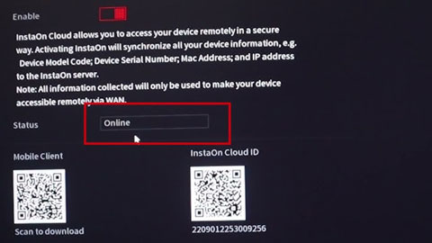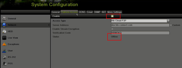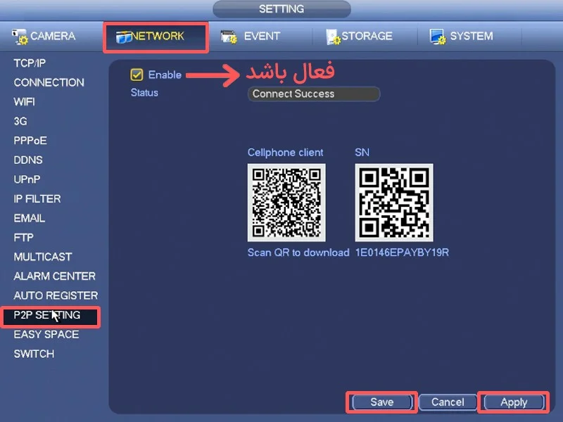 وارد تنظیمات شبکه دستگاه شوید و بخش P2P / Cloud را فعال کنید. بعد از فعالسازی، وضعیت باید حتماً Online باشد. اگر Offline باشد، حتی با اینترنت هم تصویر روی موبایل نمایش داده نخواهد شد.