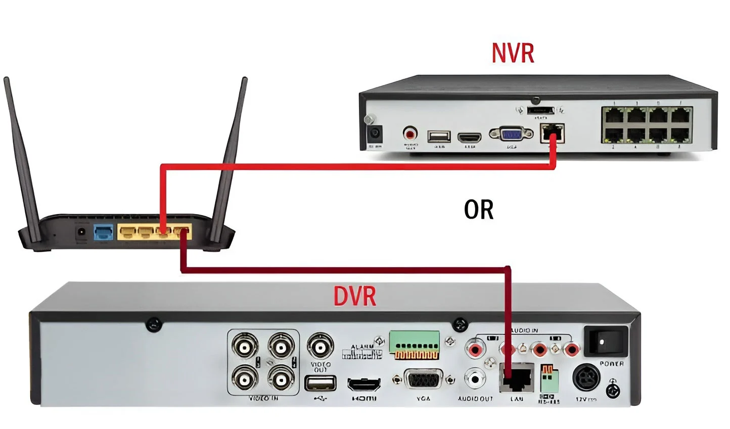 اول مطمئن شوید دستگاه DVR یا NVR با کابل شبکه به مودم وصل است و اینترنت دارد. سادهترین راه تست، فعال بودن وضعیت Online یا Connected در منوی شبکه دستگاه است. اگر دستگاه آفلاین باشد، انتقال تصویر روی موبایل انجام نمیشود.